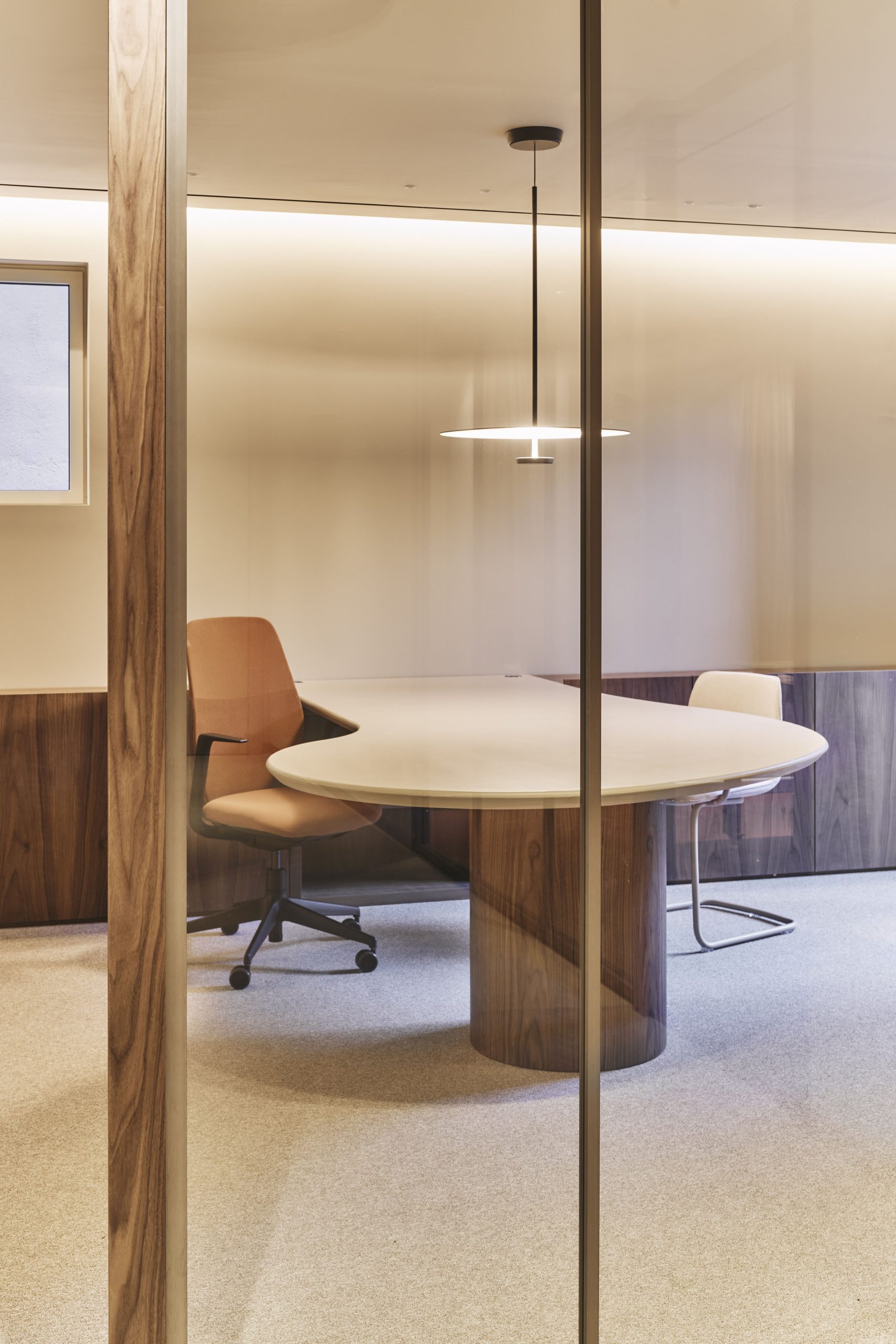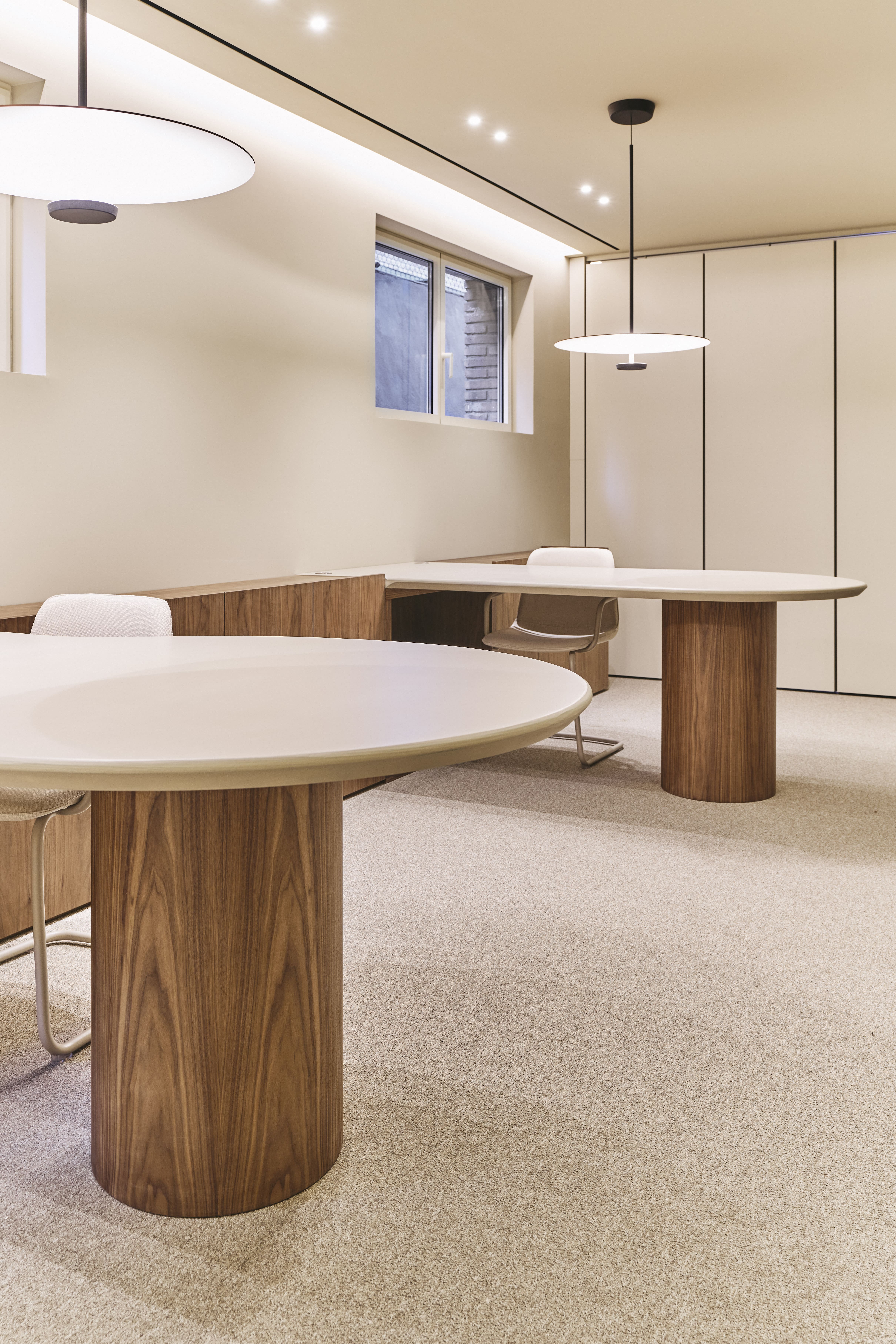 The selected materials reinforce the serene and professional atmosphere of the space: neutral tones, smooth finishes, and soft textures that provide balance and warmth without losing sophistication. Each element has been chosen to complement the dynamic nature of a contemporary office, capable of adapting to various work styles, from collaborative meetings to individual tasks.