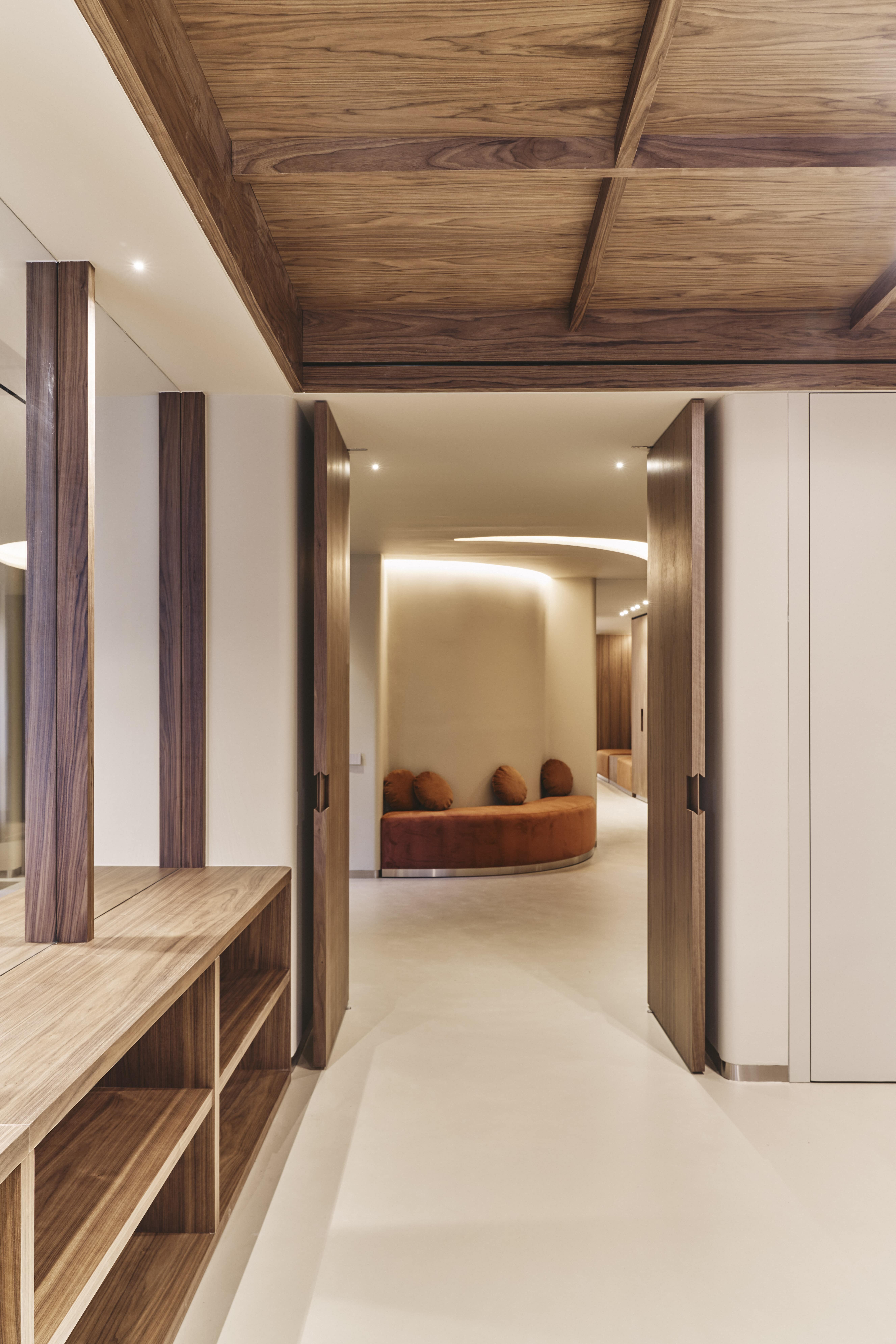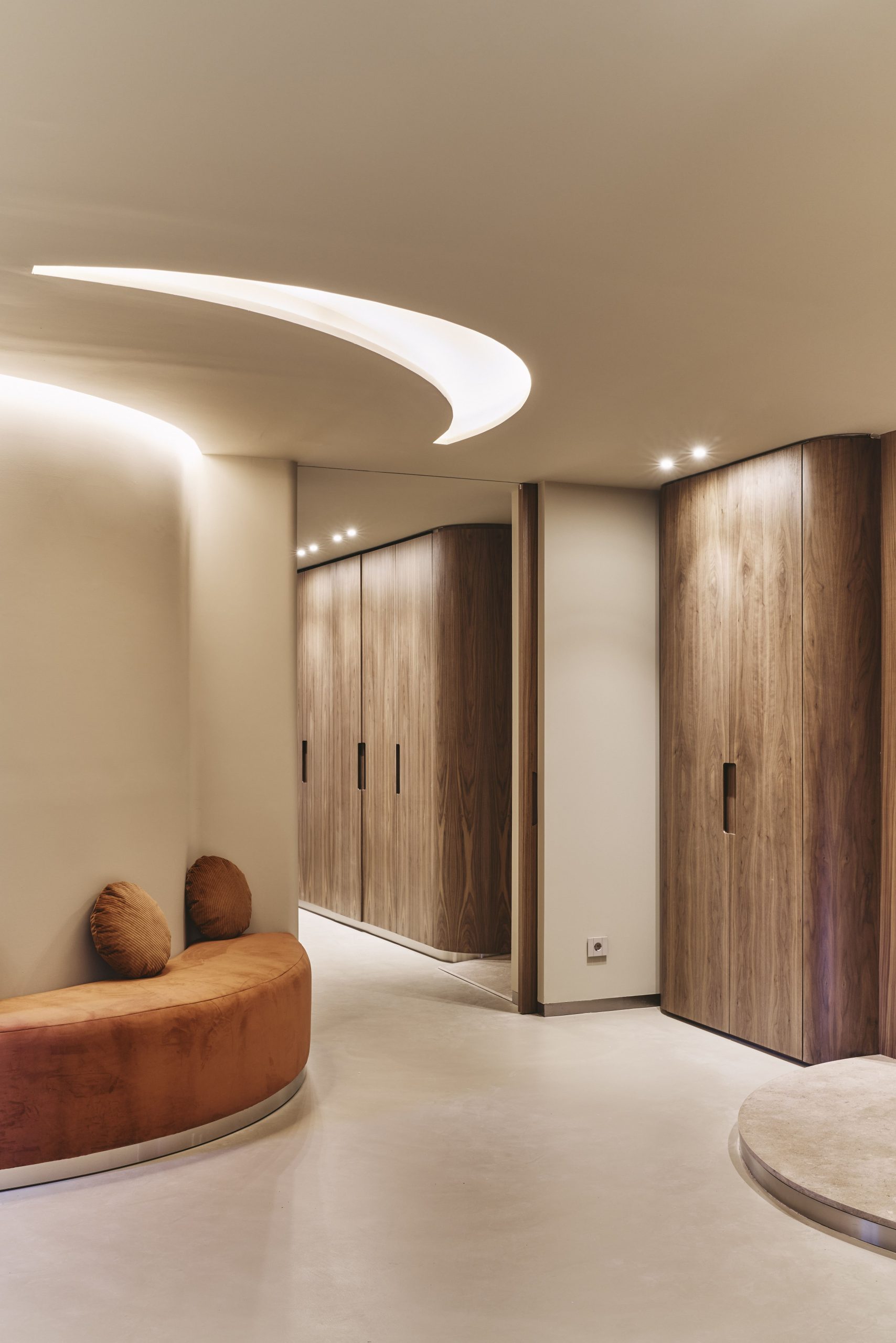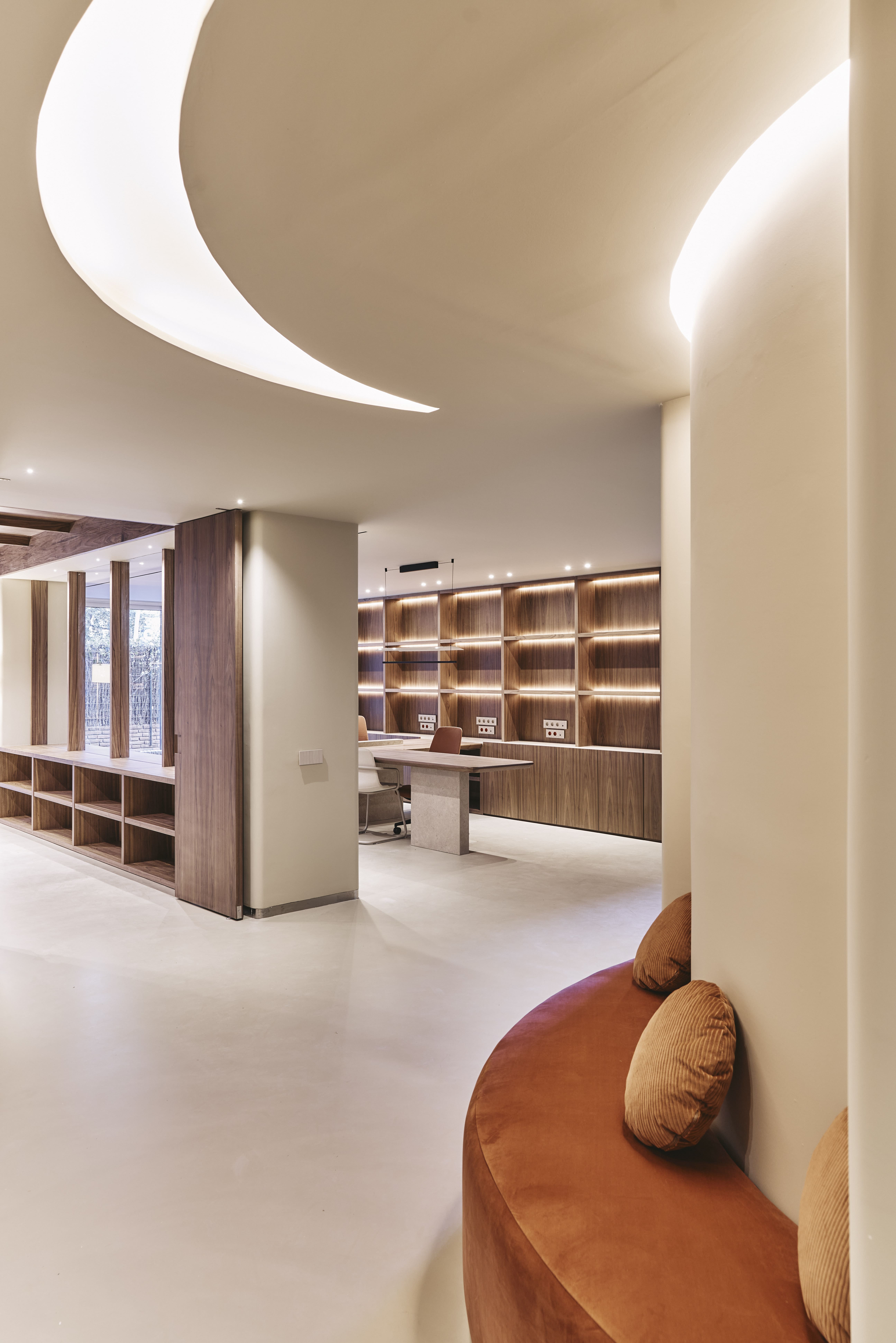 Curved forms are introduced as a key design language throughout the project. Walls, corridors, and furniture pieces adopt rounded corners, softening architectural boundaries and adding a contemporary, sophisticated touch. This formal approach not only enhances the aesthetics but also facilitates natural circulation between different areas, creating a seamless visual and physical flow.
