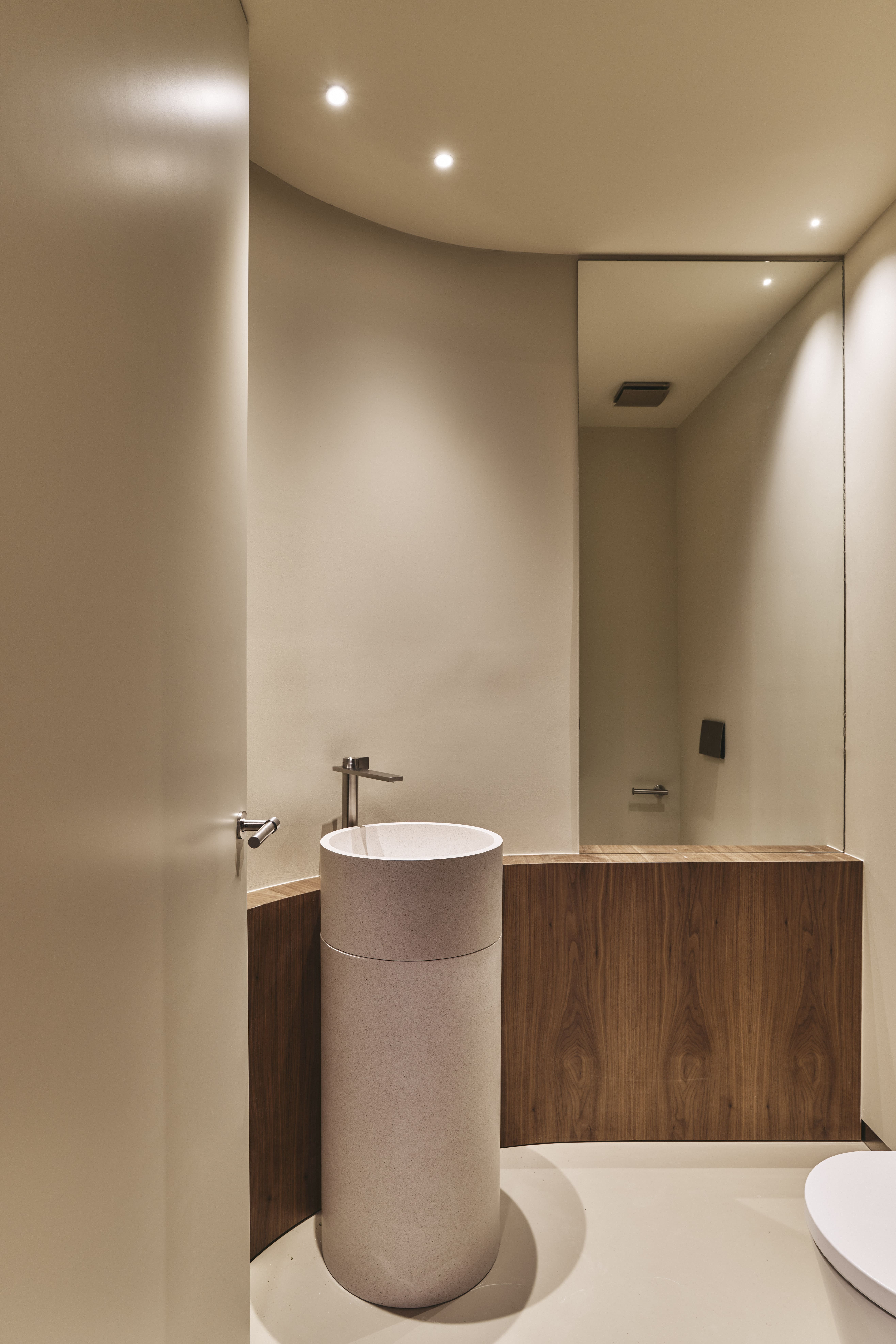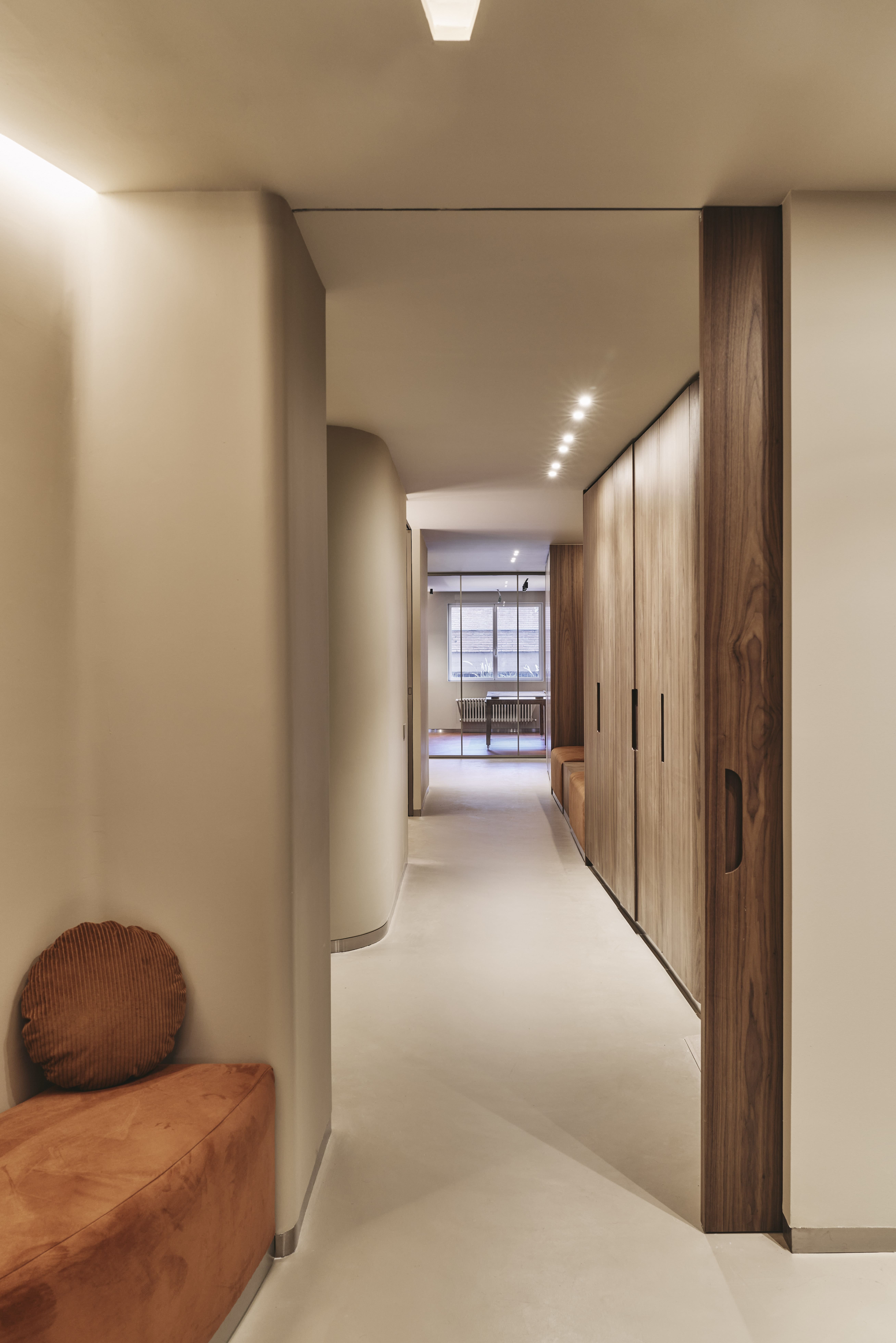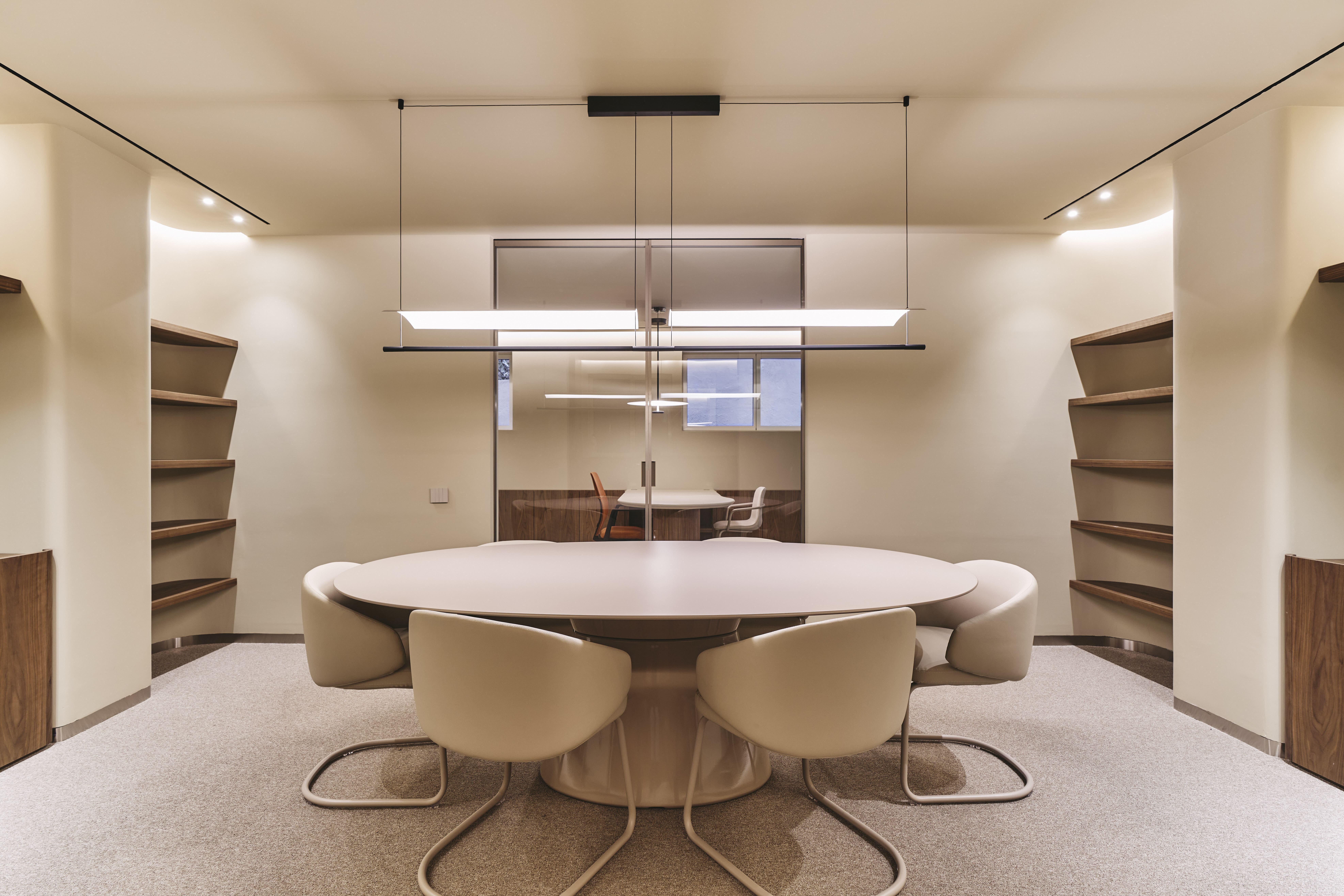 Curved forms are introduced as a key design language throughout the project. Walls, corridors, and furniture pieces adopt rounded corners, softening architectural boundaries and adding a contemporary, sophisticated touch. This formal approach not only enhances the aesthetics but also facilitates natural circulation between different areas, creating a seamless visual and physical flow.