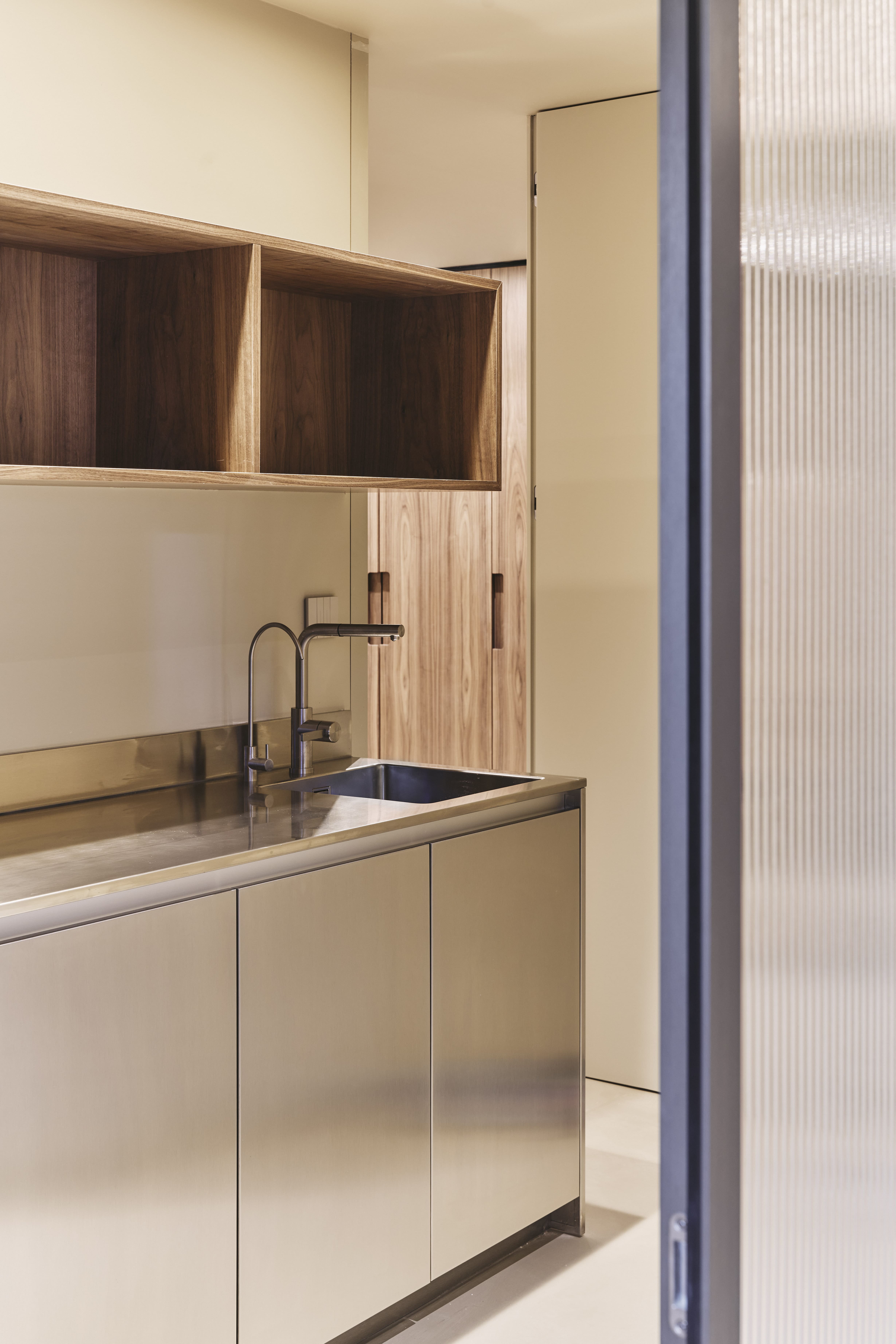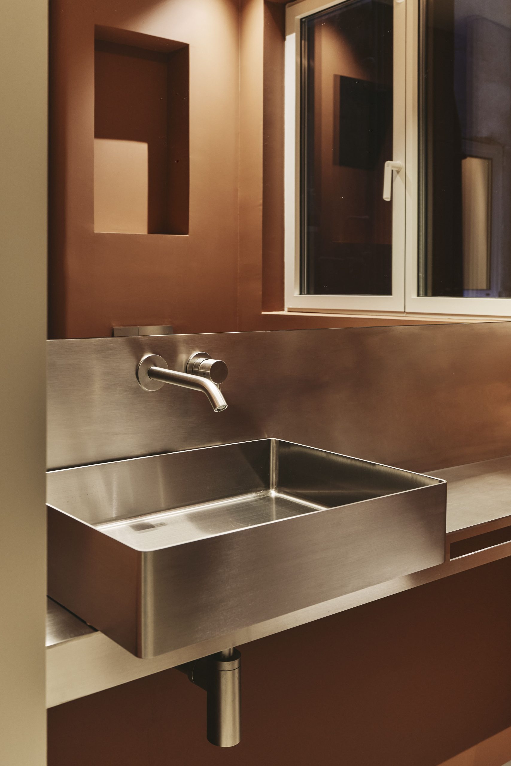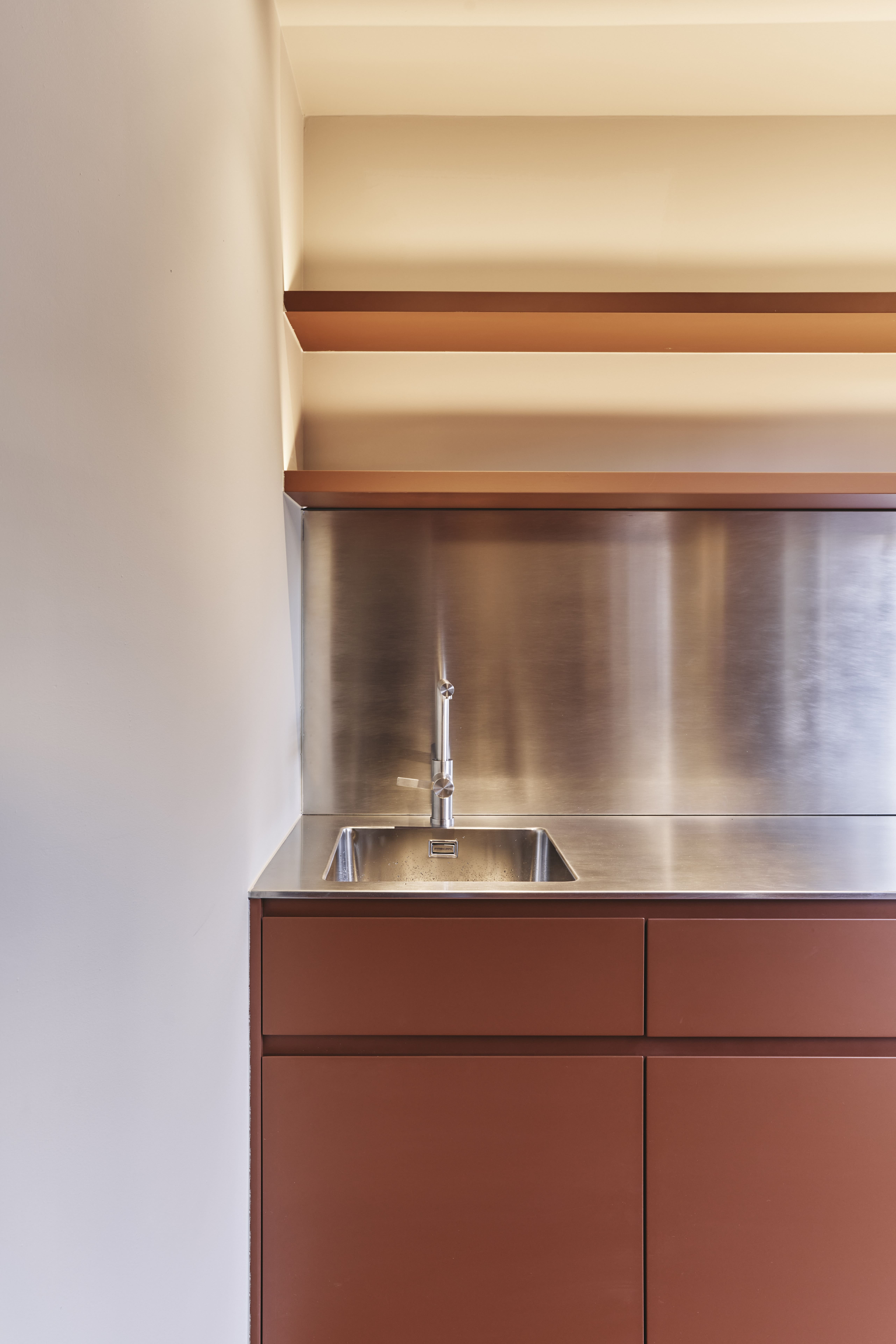 Since the space is located at street level, natural light planning has been a crucial aspect from the very beginning of the design process. The entry of light from the main and side façades has been optimized, with the aim of extending it into the deeper areas of the space through transparent surfaces, reflections, and a careful use of color treatment.