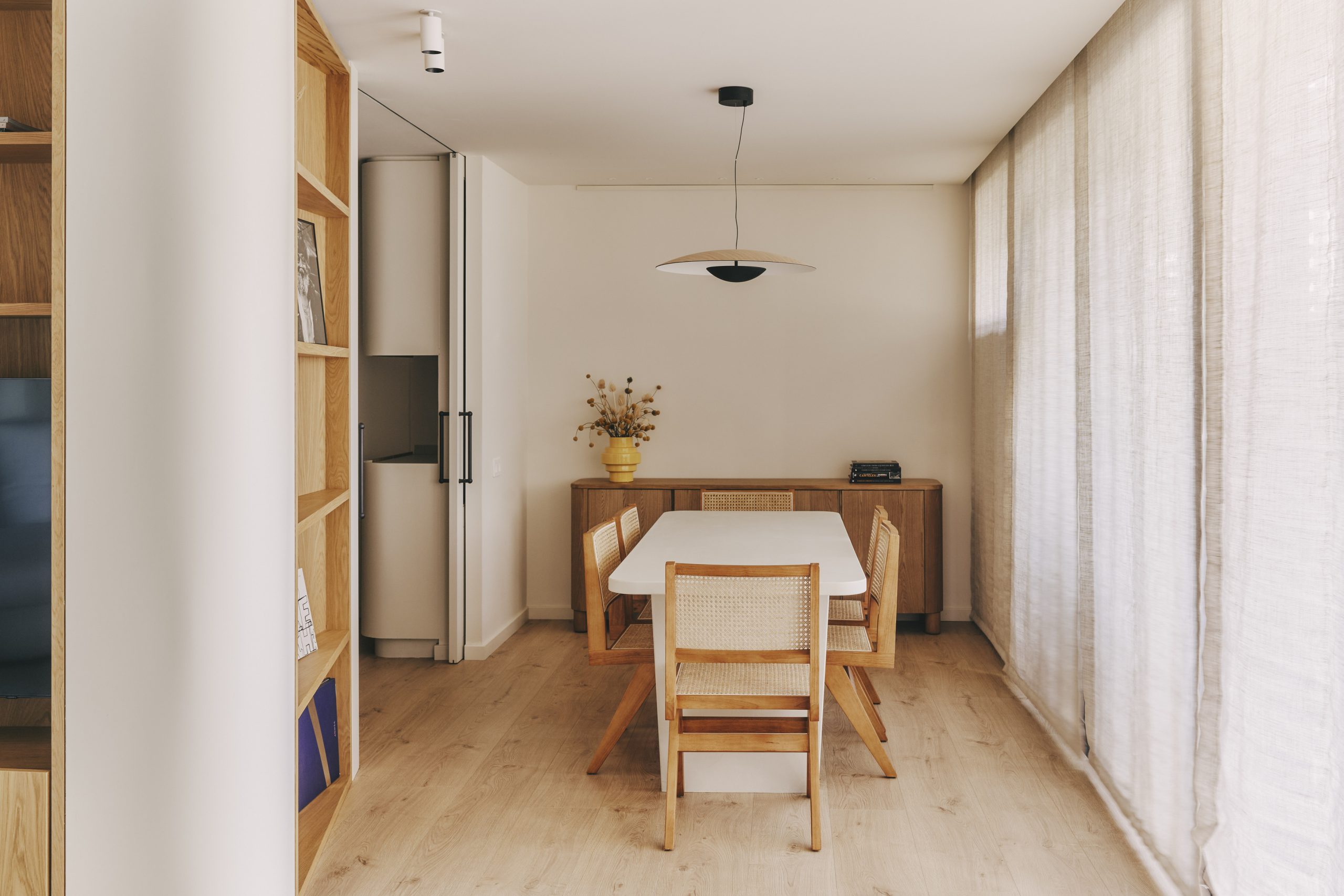 The renovation of this three-story apartment has completely transformed the space, shifting from a compartmentalized layout to a much more open and functional arrangement. The new design preserves privacy only in essential areas, such as the bedrooms and bathrooms, while the rest of the spaces have been designed to flow naturally and remain connected. This approach creates a sense of spaciousness and brightness, maximizing the connection between different areas and making the apartment feel more open and inviting.