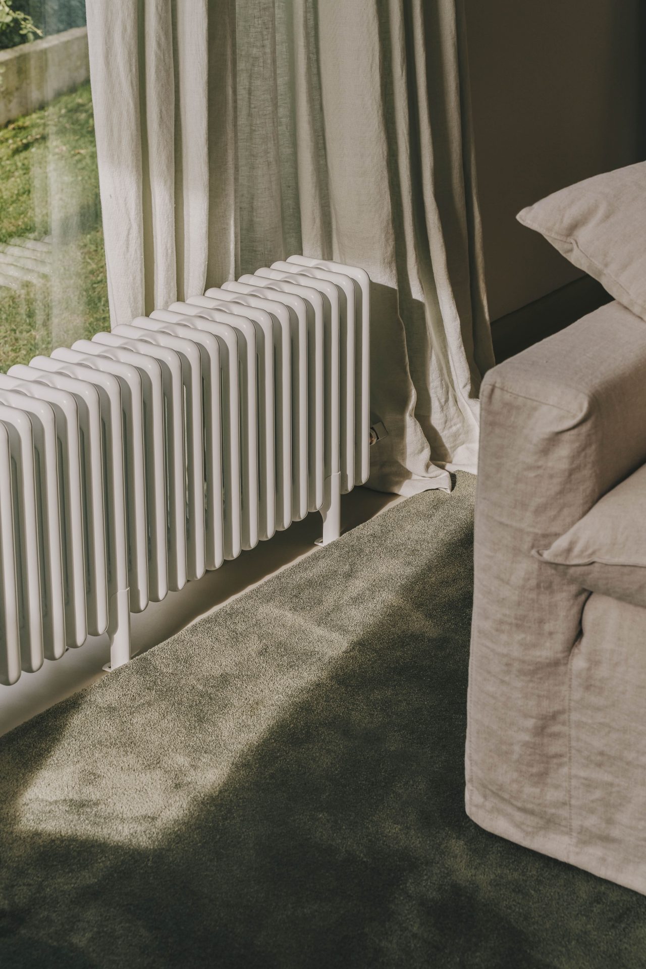 For the living area, the approach shifts towards a warmer and more serene atmosphere. Here, we combined natural wood, linen fabrics, and a range of neutral tones that bring calm and balance. A green rug serves as a focal point, adding freshness and creating a direct connection with the outdoor environment surrounding the home.
